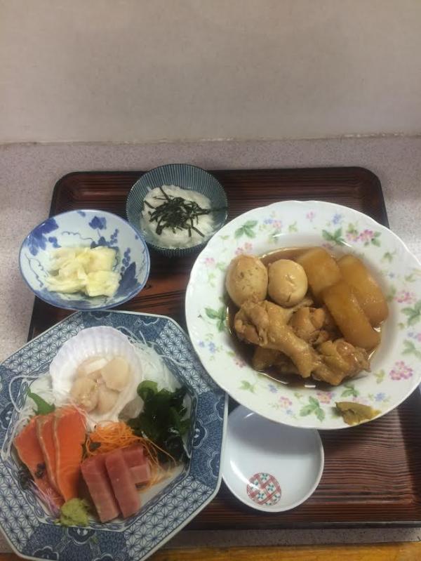 随分と雪が降り積もった今日、 お刺身と手羽元の煮つけをメインにしました