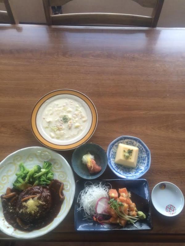 ■煮込みハンバーグ 特製 クラムチャウダー サーモン刺身