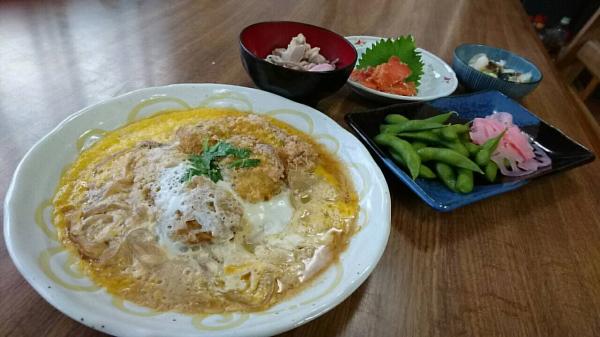 本日のメインはヒレカツとじです。 一人前に三昧のヒレカツを二個の卵でとじました。