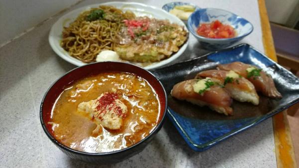お好み焼きと焼きそばセット 伊達産ブリ島寿司風