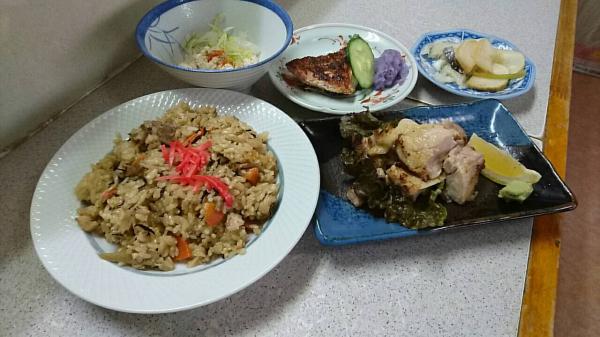 豚肩ロースの小切りにたっぷりのごぼう、人参、油揚げ等を入れて、昔懐かしい甘辛味の混ぜご飯にしました。 鶏もも肉は、こんがりと焼き目をつけて、わさびでどうぞ。