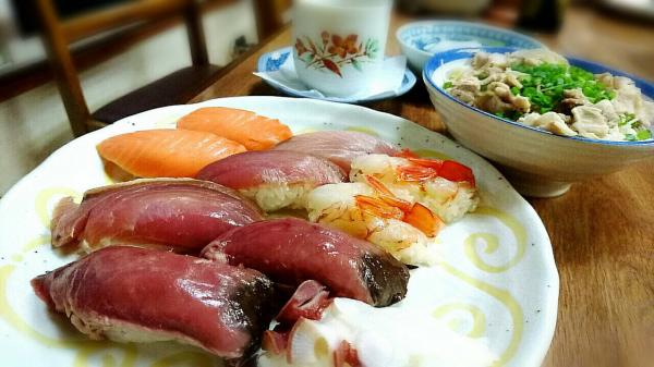 本日の生寿司のネタは、赤エビ、かつお、サーモン