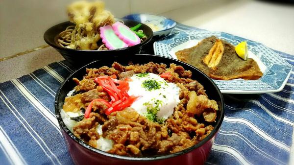 甘辛肉丼 温泉卵つき 砂鰈の唐揚げ