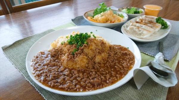 こんもりと盛り付けて、半分に挽肉あんを流します。