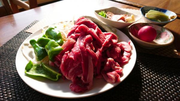 一人前300グラムのお肉です。もやし、ピーマン、茄子