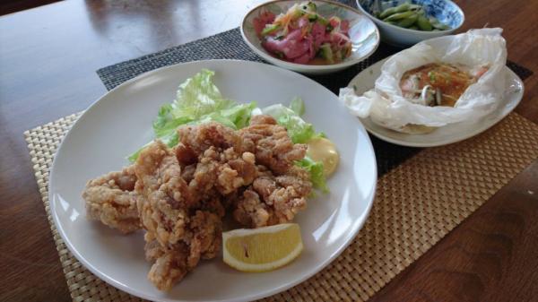 今日は、衣が美味しい鶏もも肉の竜田揚げにしました。
