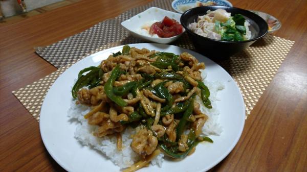 たっぷりのピーマン、竹の子、肉を素揚げして、