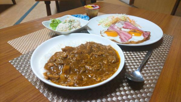 カレーと一緒で美味しいベーコンエッグ2個つきです。