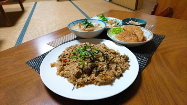豚肉、牛蒡、人参、ひじき、油揚げ、舞茸、