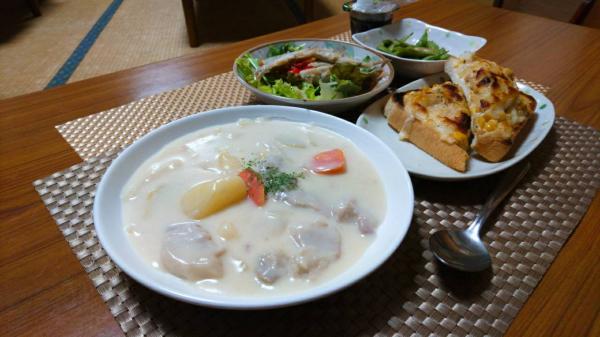 ゴロゴロ野菜と豚バラ角切りのクリームシチューです。