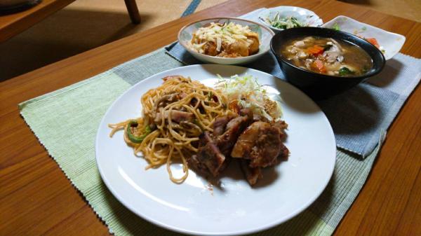 付け合せは、千切り野菜とベーコン、ピーマン入りの