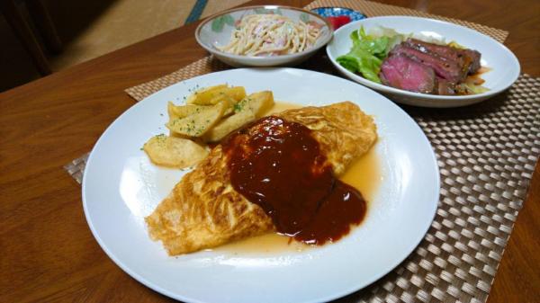 肉を盛りつけ、ソースをかけます。味噌汁は、