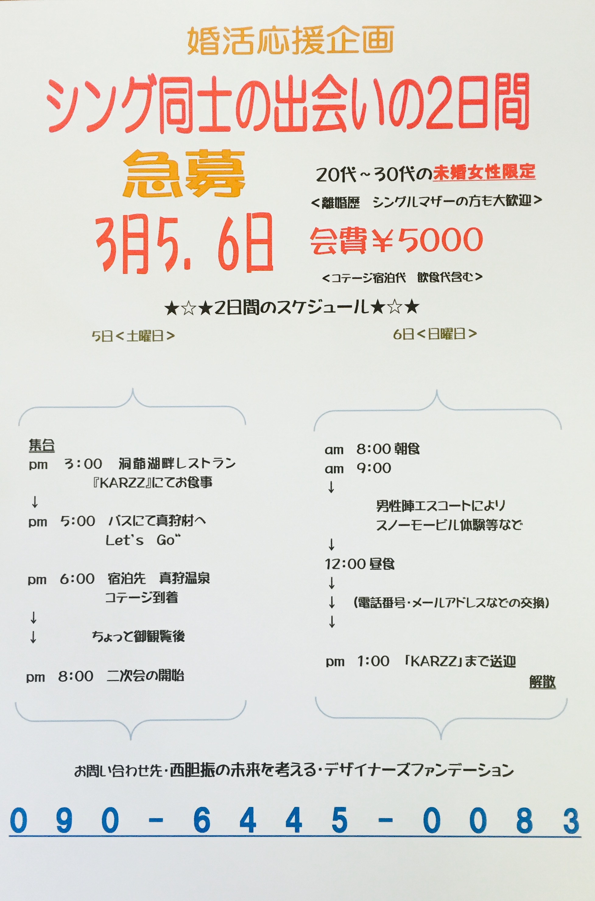 出会いの少ない環境の中で2日間という貴重な時間はきっと実のある時間になるかと思います。また開催にあたり、しあわせへの近道が開くのではないでしょうか?人それぞれの悩みはきっとたくさんあるかと思います。