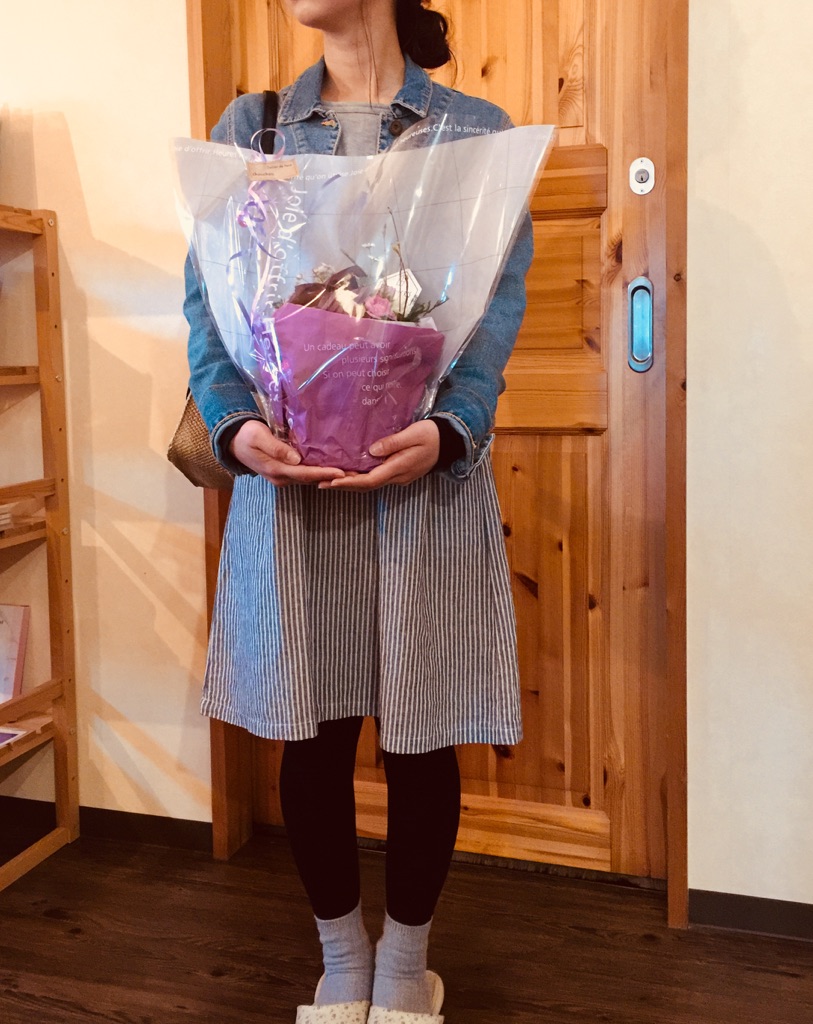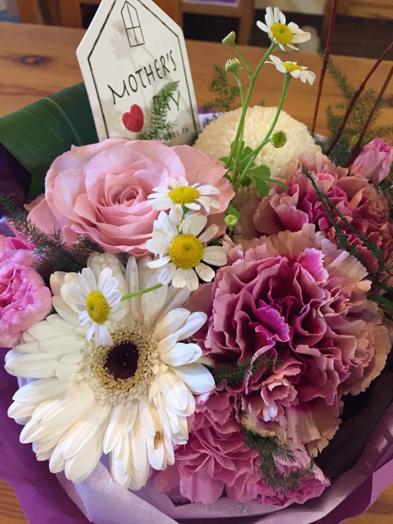 「まゆみさん 今日は母の日だからお花をプレゼントです」