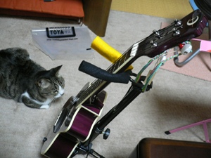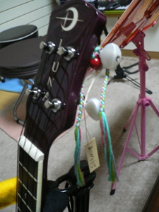 小山さまが、ご家族のために一生懸命に編まれたミサンガは、このとおり、女房のサナの楽器にしっかりと結び付けてあります。