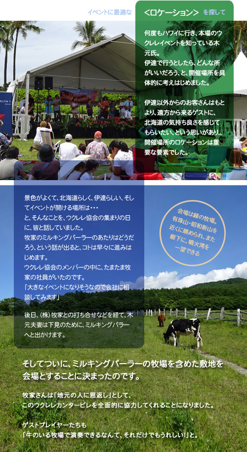 伊達では「ウクレレコンサート」ではなく「ウクレレピクニック」のようなフェスがいい、伊達でやるからには伊達ならではのおいしいものを食べられるようにもしたいし、会場は北海道的なロケーションで・・・など、ハワイと北海道を融合させた楽しいイベントにするため、計画を練りはじめます。